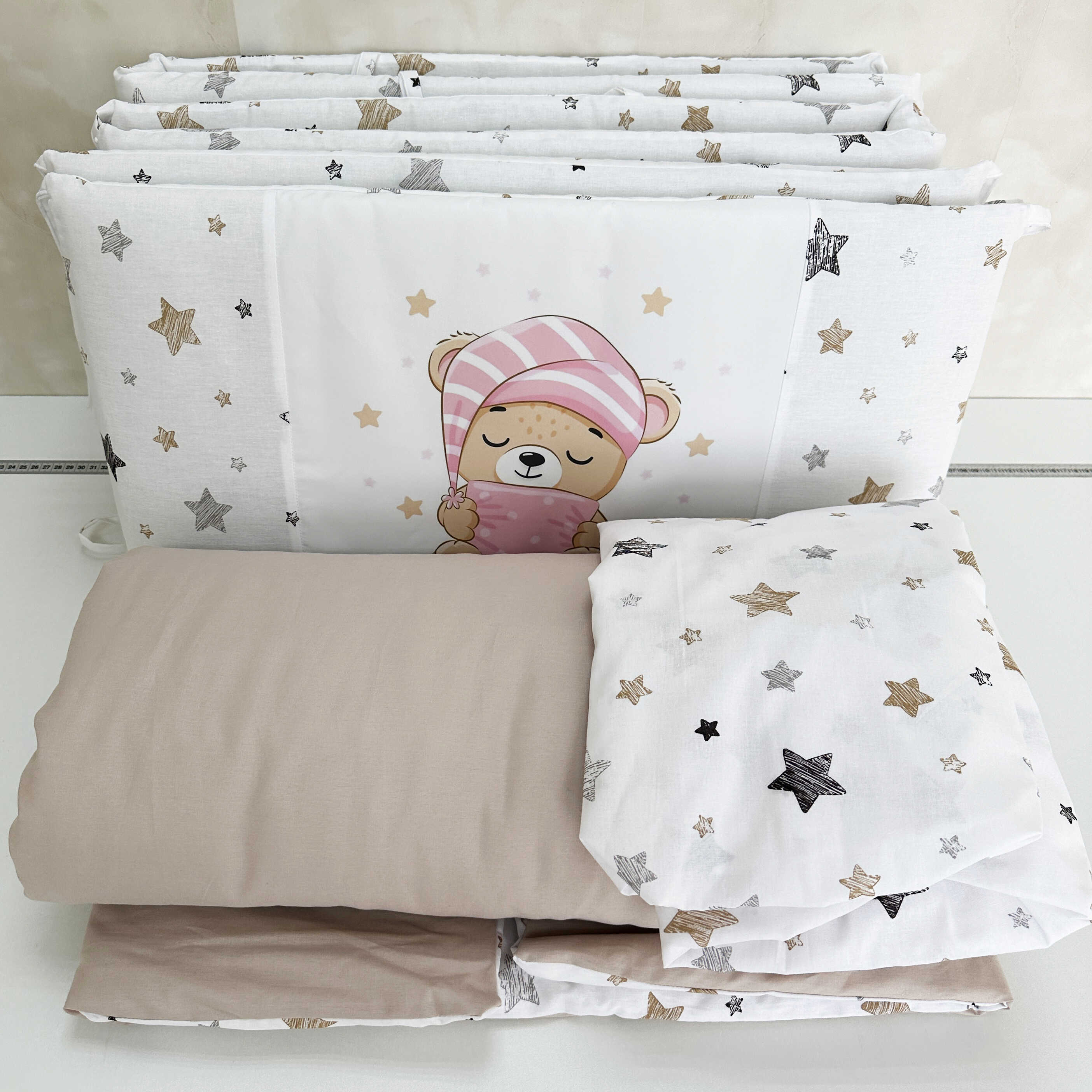 В нашем каталоге представлены детские комплекты в кроватку, состоящие из трех, шести, семнадцати и восемнадцати предметов. Сразу возникает вопрос, откуда такое непонятное количество предметов. В настоящее время, принято каждый элемент считать отдельным предметом комплекта. К примеру, один бортик может состоять из нескольких элементов (подушечек) и уже будет считаться не за один, а за несколько предметов. Насколько это правильно и не вводит ли покупателя в заблуждение, мы не разбирались. Поэтому помните, когда Вы видите комплекты в детскую кроватку с большим количеством предметов, не торопитесь с покупкой, убедитесь в необходимости Вам этих товаров.